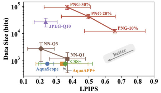 AquaScope achieves 36.7%~40% performance gains in LPIPS compared to the existing systems.